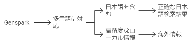 Gensparkは日本語を含む多言語に対応しており、ローカル情報にも高精度な結果を提供します。日本語の情報収集でも精度の高い検索結果が得られ、海外情報も多言語対応で検索可能です。